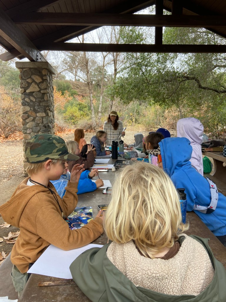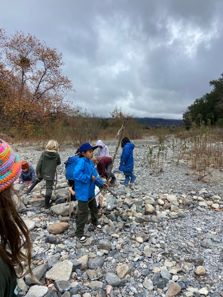 The morning meeting sets our intention for the day. On the first and last week of the month we hold parent meetings simultaneously. This last Thursday a parent meeting was being held while I was holding the morning meeting under our large oak tree. There’s a cluster of trees that include both sycamore and oak. When there’s a light rain the cluster of trees typically keeps the area below dry. Not on Thursday… we were about 10 minutes in when we all had to get up and move ourselves underneath the structure over the picnic tables. We finished our morning meeting and rushed over to the creek bed to see if we had any water yet.